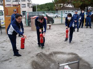 月ごとの避難訓練の際には「模擬消火器」を使用した教職員の消火訓練を実施し、秋には「消防署立会いの避難訓練」を行なっています。