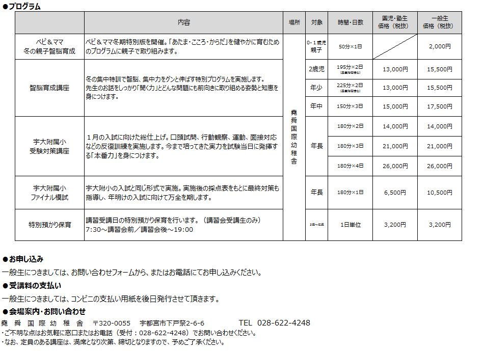 12/18(水)~12/27(金)まで、0歳児から年長児を対象に、各種講習会を実施いたします。