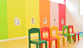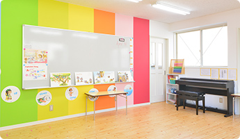 英語で楽しく過ごし、学べる教室。光が差し込み、明るくカラフルな子どもらしい教室です。
